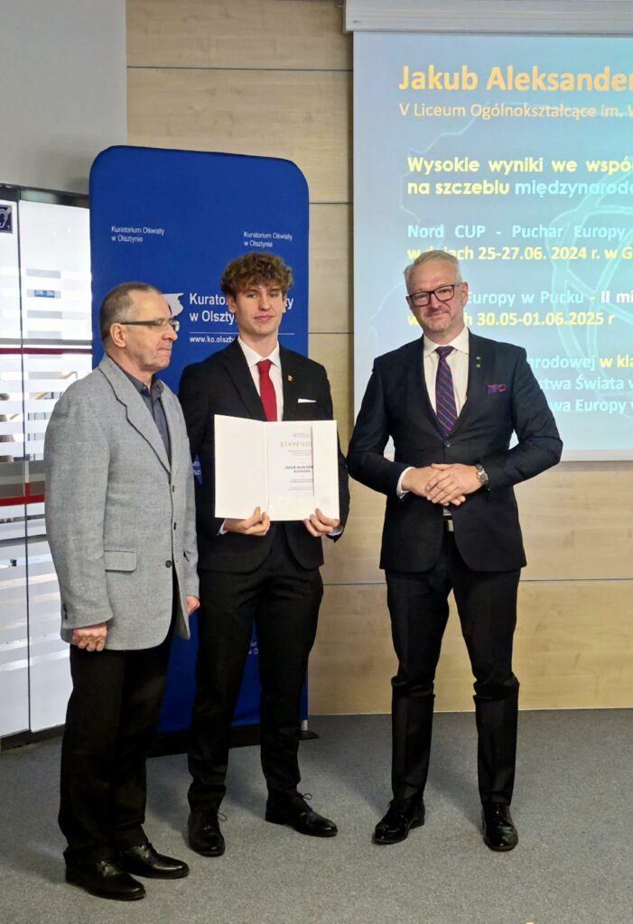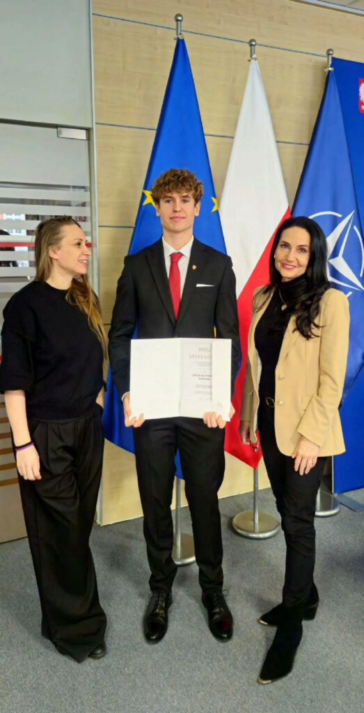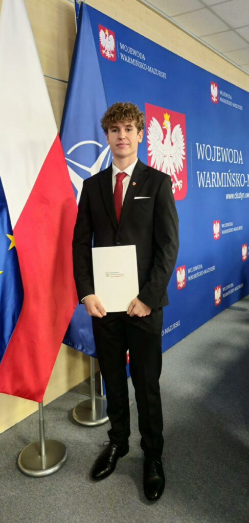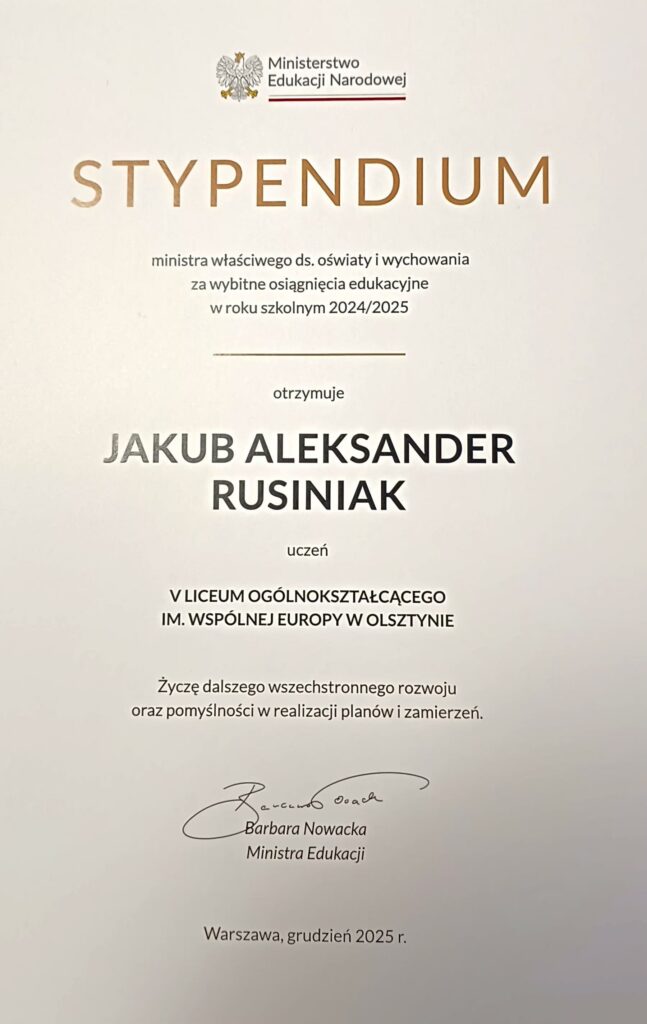 Z ogromną dumą informujemy, że uczeń V Liceum Ogólnokształcącego im. Wspólnej Europy w Olsztynie — Jakub Rusiniak — znalazł się w gronie zaledwie 18 stypendystów z całego województwa warmińsko-mazurskiego, którym przyznano prestiżowe Stypendium Ministra Edukacji Narodowej za wybitne osiągnięcia w roku szkolnym 2024/2025!