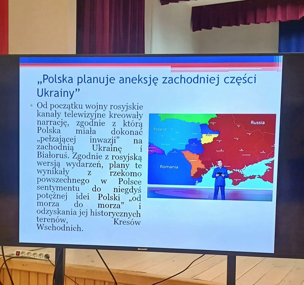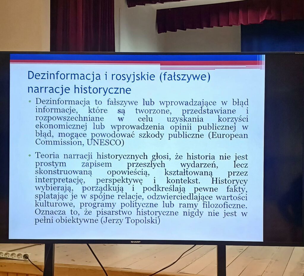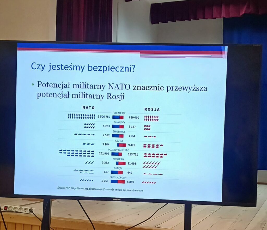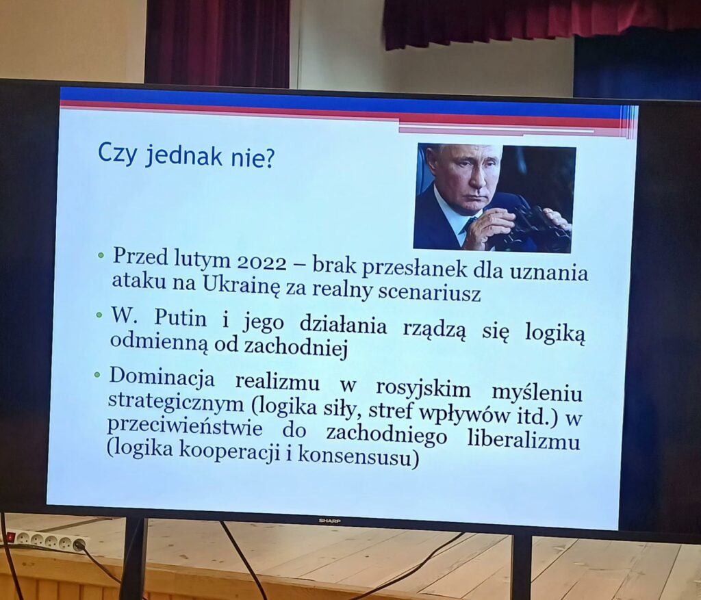 Pan profesor pokazał konkretne mechanizmy tworzenia dezinformacji wraz z przykładami (np. rzekome plany aneksji zachodniej Ukrainy przez Polskę) oraz strategie obrony przed manipulacją. Co cieszy? Mimo ograniczonego czasu młodzież włączyła się w dyskusję, zadając pytania, m.in. o incydenty z rosyjskimi dronami w polskiej przestrzeni powietrznej oraz reakcję Białorusi na te wydarzenia. Zależy nam, by nasi uczniowie nie tylko zyskali wiedzę, ale też byli świadomi mechanizmów socjologiczno-propagandowych, którym są poddawani w przestrzeni medialnej. To kluczowa kompetencja świadomych obywateli XXI wieku.