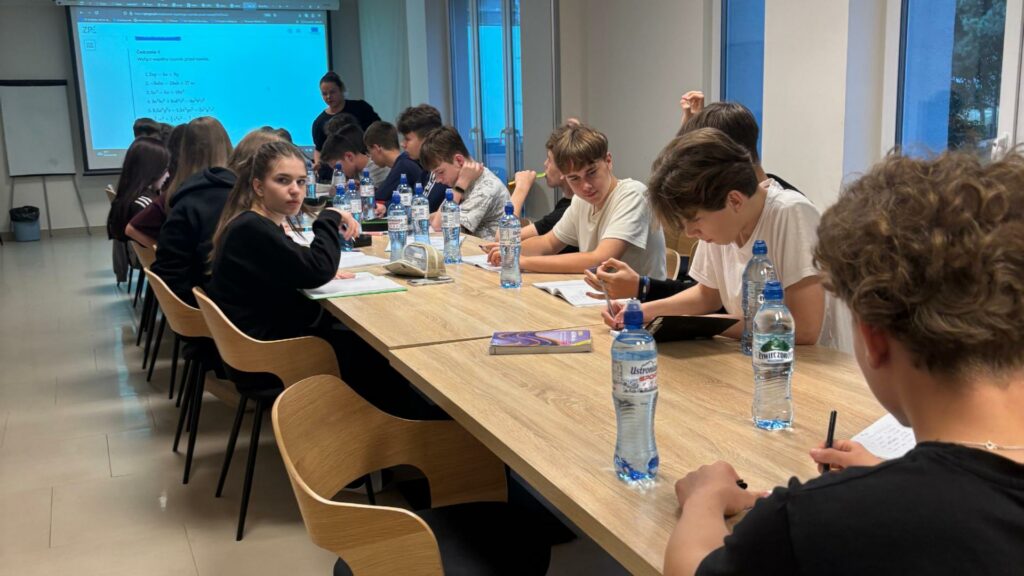 Młodzież rozwiązywała równania nie tylko w sali konferencyjnej, ale też – przy pięknej pogodzie ☀️ – na świeżym powietrzu z widokiem na jezioro.🌲