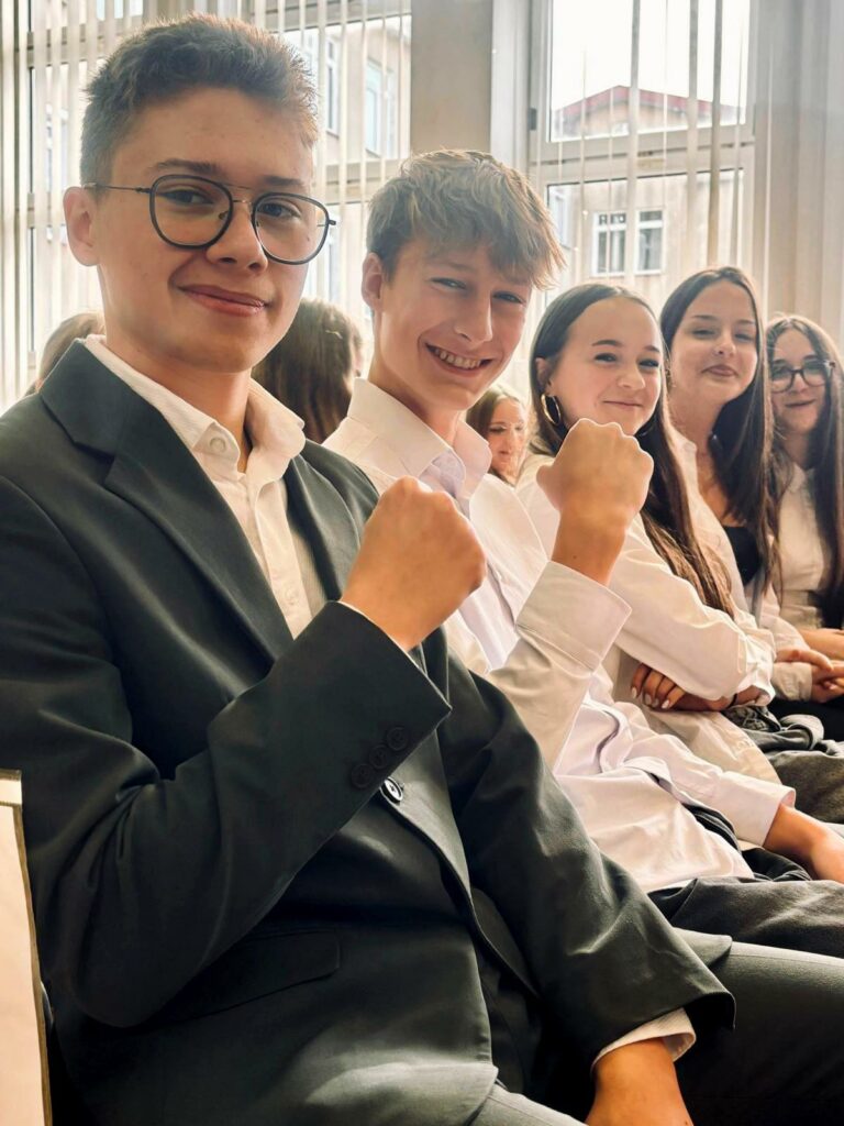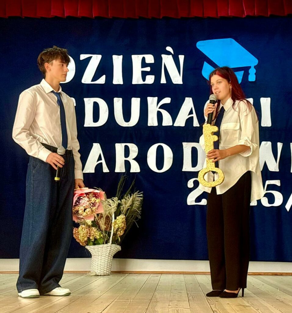Nasza dotychczasowa przewodnicząca Nadia Kamińska przekazała symboliczny klucz nowemu liderowi – Wiktorowi Weckwerthowi. Nadio – DZIĘKUJEMY za każdy pomysł, każdą inicjatywę i serce, które włożyłaś w życie szkoły! Wiktorze – jesteśmy z Tobą i czekamy na Twoje świeże pomysły!